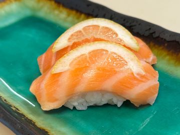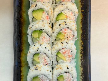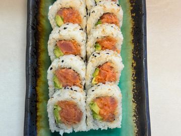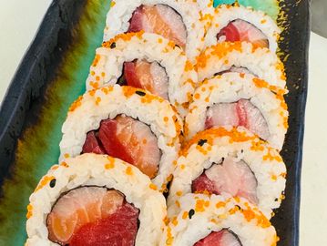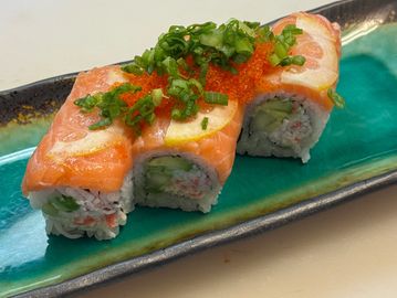 Crab, Cucumber, Avocado Topped w/Salmon*, Lemon , Scallions, Tobiko.
