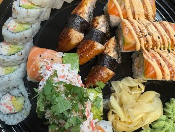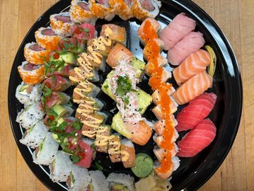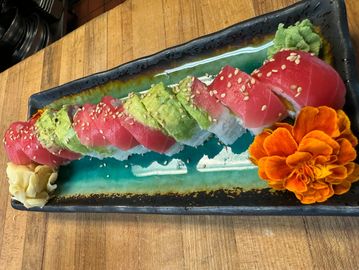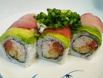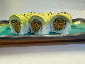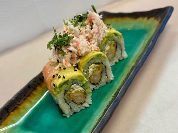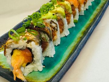 Krab mix, Spicy Tuna , Cucumber, Tempura Shrimp Topped/Tuna*, Hamachi*, Avocado, Scallions , Teriyaki Sauce.