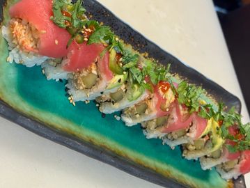 Spicy Krab, Jalapeño, Cucumber, Topped w/Tuna*, Avocado, Cilantro, Sriracha.